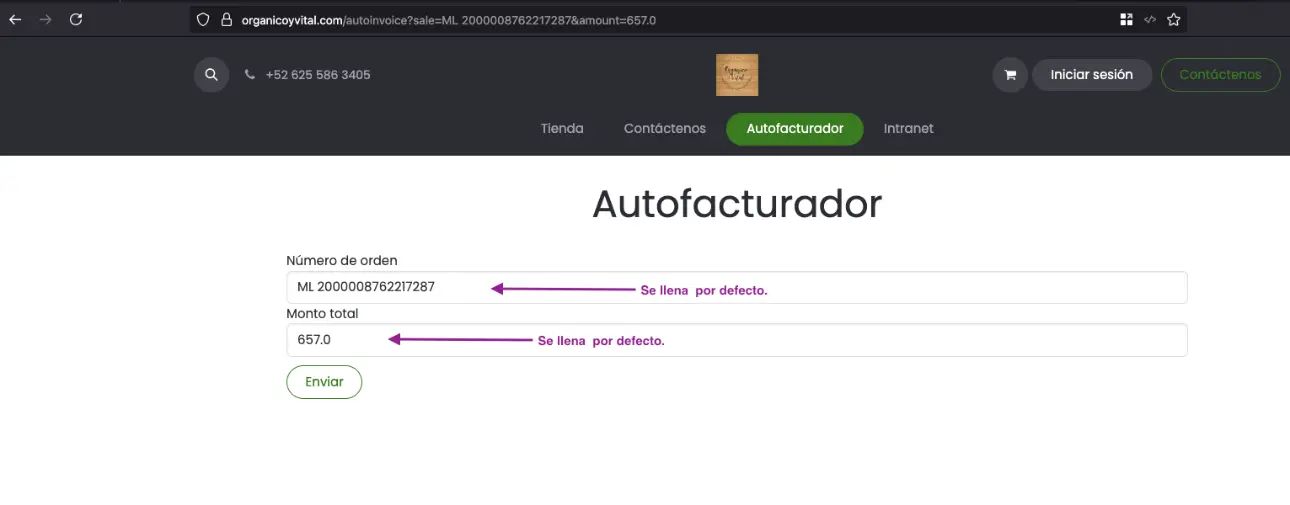 En automático podrá ver que los campos se llenan por defecto con su pedido y monto, solo es necesario dar Enviar.